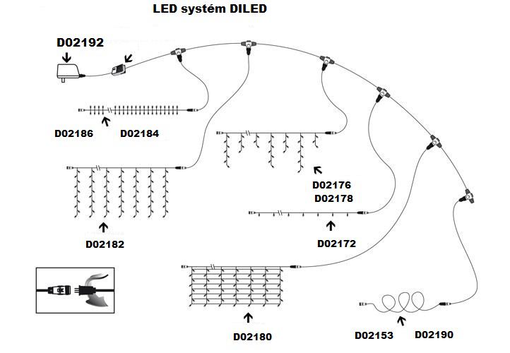 Systém vánočního osvětlení diLED je jedinečný, díky nepřeberným možnostem napojení a rozšíření řetězů. Můžete si vybrat z celé nabídky a řetězy na sebe vzájemně napojovat a díky ovladači přidávat i světelné funkce. Systém diLED se již kvalitou blížíprofesionálnímů osvětlení. Průměrná životnost LED žárovek je přibližně 50 000 hodin svícení. Řetěz je vhodný jak pro venkovní, tak i pro vnitřní použití. Na jeden napájecí adaptér můžete napojit až 2 000 diod v rámci diLED systému.