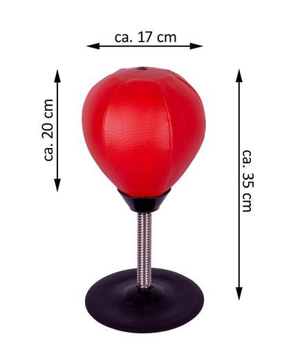 Robustní minifunkční boxovací hrušna na stůl nebo do kanceláře. Kaučuková přísavka spolehlivě přilne k jakémukoliv plochému povrchu. Tak je boxerský míč připraven na tvrdé zásahy. Pružná ocelová pružina umožňuje rychlý návrat hruškyzpět do původní polohy. Boxovací sada je dodávána s pumpičkou s jehlovým ventilem, můžete tak sami určit stupeň tvrdosti samotného míče.