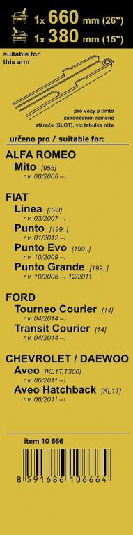 Délky stěračů a systém uchycení na ramínko jsou přizpůsobeny vybraným vozům (viz tabulka použití). Vysoce kvalitní pružný člen plochého stěrače zajišťuje stejnoměrný tlak grafitového břitu v celé jeho délce, což zamezuje rozmazávání nečistot a vytváření pruhů.