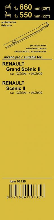 Sada dvou plochých stěračů typu Flat (řidič + spolujezdec) se speciálním uchycením. Dopřejte si zásobu těchto kvalitních stěračů. Délky stěračů a systém uchycení na ramínko jsou přizpůsobeny těmto vybraným vozům - Renault Grand Scénic II 12/04 - 04/09, Renault Scénic II 12/04 - 04/09