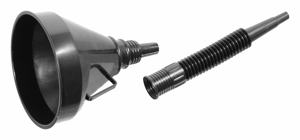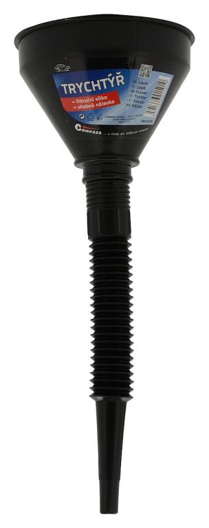 Trychtýř pro přelévání kapalin, vybavený zabudovaným sítkem a šroubovací nálevkou. Nálevka délky 25 cm je ohebná a nabízí tak pohodlí při manipulaci a přelévání. Trychtýř je zhotoven z odolného plastu černé barvy o průměru 143 mm.