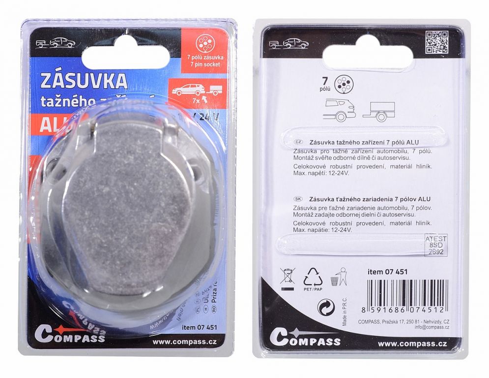 Celokovová ALU zásuvka pro tažné zařízení automobilu dle normy DIN 1724, 7 pólů. Zásuvka je vybavena jak těsněním na montážní straně, tak i těsněním, přímo uvnitř konektoru, takže zajišťuje ještě důkladnější voděodolnost. Dále je vybavena kovovým krytem, který se automaticky (pružinou) uzavírá.