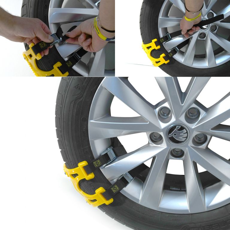 Univerzální vyprošťovací pásy pro nouzové vyproštění ze sněhu i náledí. Pásy jsou vhodné pro všechny běžné rozměry pneu (ALU i ocelové disky). Dokonalé upevnění, s rychlou a zároveň snadnou montáží je zajištěna stahovacími pásy s přezkami.