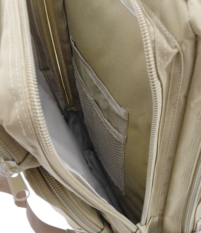 Praktický batoh vojenského vzhledu na tůry do přírody. Přední strana batohu obsahuje Molle systém - což je systém, který slouží pro uchycení dalších doplňků k výpravě. Každá kapsa je zajištěna bytelným dvoucestným zipem. Vnitřní kapsy a sítěná kapsa jsou doplněné o poutka pro bezpečné nošení drobných předmětů. Jedna z vnitřních kapes je opatřena klasickým zipem a zadní větraná kapsa je opatřena suchým zipem.