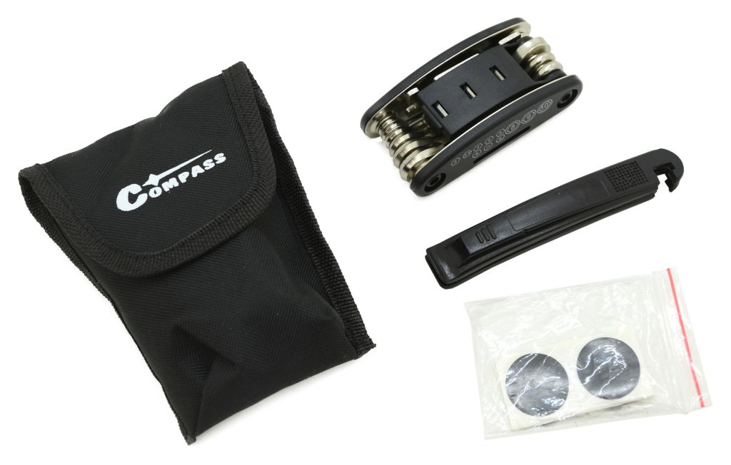 Praktická brašnička s multifunkčním nástrojem a samolepícími záplatami na duše, se snadným uchycením na jízdní kolo pomocí pásku se suchým zipem. Brašna byla vyrobena z odolného materiálu a je uzavíratelná na rozměrný suchý zip. Uvnitř skrývá prostor s multifunkčním nástrojem, montpákami pro snadnou demontáž pneumatik, plíškem pro zdrsnění a samolepících záplat na duše pneumatik. Multitool je složen z 6x imbusových klíčů (2/2,5/3/4/5/6 mm), křížového a plochého šroubováku, stranovým klíčem (8/10/15 mm a klíčem 14GE na výplet kol) a v neposlední řadě čtyřhranným šroubovákem spolu s HEX nástavci (8/9/10 mm).