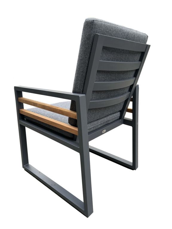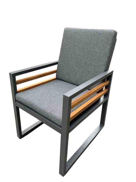 Luxusní hliníková souprava v grafitovém provedení, doplněna o dřevěné výplně z novozélandské borovice ošetřené pryskyřicí a voskovým olejem a stolovou desku z teaku. Moderní souprava, která skvěle zapadne do každého exteriéru či interiéru.