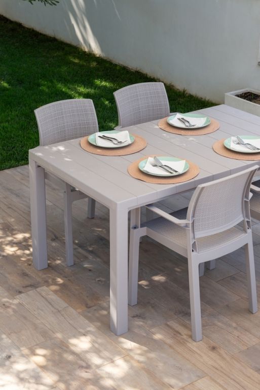 Díky svému imitovanému dřevěnému povrchu se obdélníkový stůl stává neodolatelným kouskem nábytku pro Vaše venkovní prostory. S dostatečným prostorem pro 4 až 6 osob představuje ideální místo pro setkání s rodinou a přáteli.