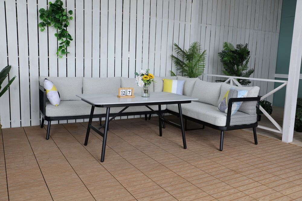 Luxusní rohová hliníková souprava v černém provedení, doplněna o stolovou desku z hliníku a pryskyřice v dezénu kamene. Moderní souprava, která skvěle zapadne do každého exteriéru či interiéru. Velmi pohodlné podušky z předené tkaniny (polyester 460g/m2, vodu odpuzující tkanina) s molitanovou výplní (12 cm) jsou odolné UV záření. Všechny podušky jsou vybaveny zipy, díky kterým můžete polyesterový potah jednoduše sundat. Souprava má díky použitým materiálům a modernímu vzhledu opravdu široké využití, je vhodná pro vnitřní i venkovní prostory - zahrady, terasy, zimní zahrady nebo třeba do uvítací haly či recepce. Díky jednoduché montáži, budete moci již po chvíli soupravu naplno využít.