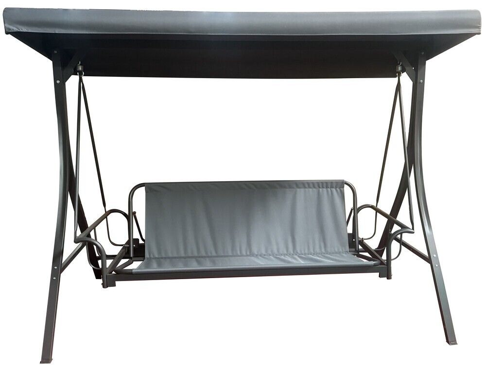 Ocelová konstrukce ošetřena práškovou barvou, podušky (polyester 160 g), výplň polyesterová vata, stříška (polyester 180 g), pro 3 osoby