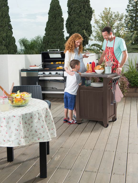 Mobilní skříňka, kterou oceníte především při grilování! Prostorná skříň s dvojitými dveřmi vybavená funkční nerezovou deskou a praktickou rukojetí s háčkem na ručníky, bude dobře fungovat při důležitých rodinných setkáních na terase nebo na zahradě.