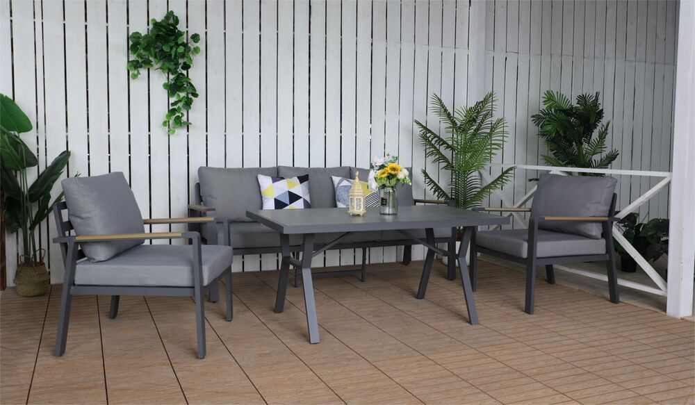 Luxusní hliníková souprava v grafitovém provedení, doplněna o stolovou desku z hliníku a pryskyřice v dezénu kamene. Moderní souprava, která skvěle zapadne do každého exteriéru či interiéru. Velmi pohodlné podušky z předené tkaniny (polyester) s molitanovou výplní. Všechny podušky jsou vybaveny zipy, díky kterým můžete polyesterový potah jednoduše sundat. Souprava má díky použitým materiálům a modernímu vzhledu opravdu široké využití, je vhodná pro vnitřní i venkovní prostory - zahrady, terasy, zimní zahrady nebo třeba do uvítací haly či recepce. Díky jednoduché montáži, budete moci již po chvíli soupravu naplno využít.