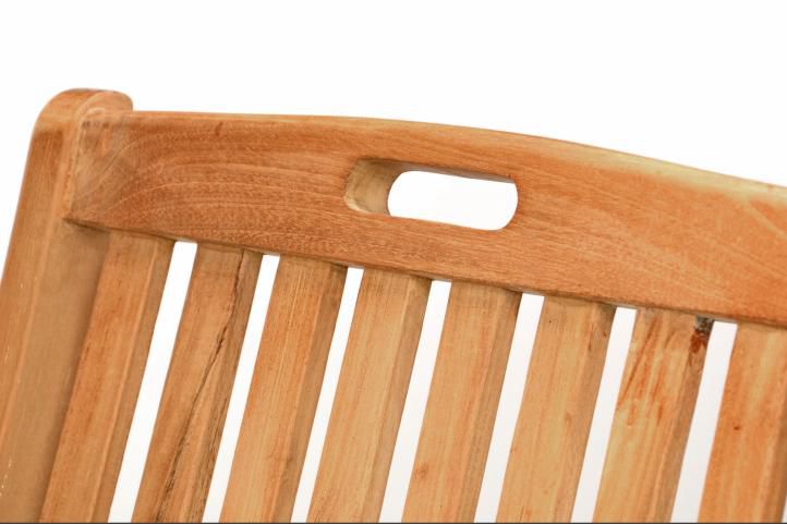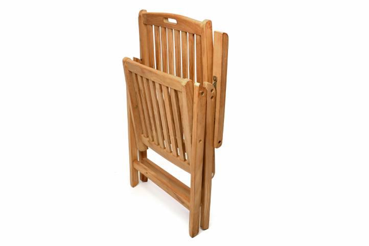 Kvalitní skládací židle vyrobena z týkového dřeva je ideální na terasu nebo zahradu. Zahradní nábytek z tohoto dřeva je vysoce kvalitní a mimořádně spolehlivý produkt. Týkové dřevo je charakteristické svým četným žilkováním a obsahem éterických olejů, které mu zaručují odolnost proti větru a dalším vlivům počasí. Týk je pro svou vynikající odolnost oblíben již po staletí i v lodním stavitelství. Židle má vysoké opěradlo s 5-ti nastavitelnými stupni. Židle je skládací a umožňuje snadné uskladnění.