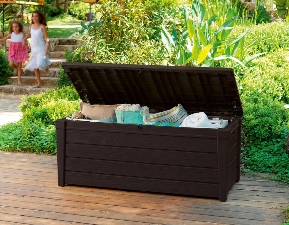 Větší plastový box s úložným prostorem o obsahu 455 L. Plast vzor - imitace dřeva. Brightwood odkládací box umožňuje pohodlně uložit vše, co chcete mít po ruce na vaší zahradě. Vyznačuje se velkou kapacitou, díky tomu se do něj vejde například - zahradní nářadí, polštáře nebo přikrývky. Jeho montáž je velmi jednoduchá a nevyžaduje žádné specializované nástroje. Mechanismus, který usnadňuje otevření víka je nepochybné velkou výhody produktu.