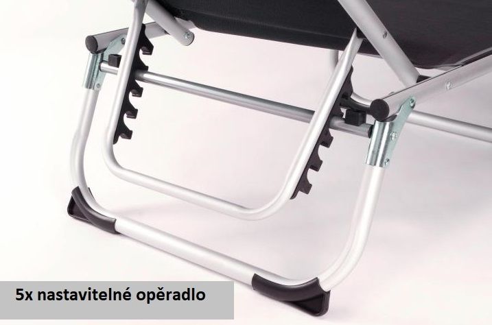 Skládací hliníkové lehátko nastavitelné do 5 poloh se sklopnou stříškou má protiskluzové nožičky s ochrannými kryty proti poškrábání zajišťující stabilní držení, ať už na louce, na písku nebo betonu. Trojnohý hliníkový rám je extrémně robustní. Relaxační lehátko má odolný potah proti vodě a je snadný na údržbu. Lehátko je vhodné pro vnitřní i venkovní použití.