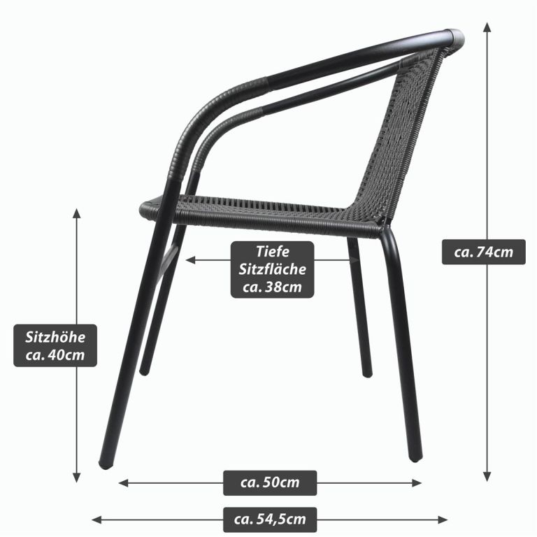Bistro židle pro pravou středomořskou atmosféru ve stylu francouzských kaváren a bister je lehkým a vkusným kouskem k posezení. Několik židlí tohoto typu můžete naskládat na sebe a ušetřit tak spoustu místa, pokud chcete židli odložit a uložit ji na zimní měsíce. Použité materiály u této židle jsou nenáročné na údržbu, odolné vlivu počasí a nevyžadují speciální prostředky na ošetření. Lehká a přesto robustní stohovatelná židle s komfortní ratanovou sedací plochou je velmi pohodlná. Ocelová konstrukce je ošetřená práškovým povrchem a nohy mají gumové krytky, které zabraňují uklouznutí, tlumí hluk při pohybu a chrání podlahu. Polyrattan je vyroben z plastu, je odolný proti roztržení a zajímavě tkaný. Zkombinujte tyto stohovací židle s odpovídajícími malými kulatými bistro stolky dostupnými v našem obchodě. Tímto způsobem si můžete nakonfigurovat svůj vlastní bistro set.